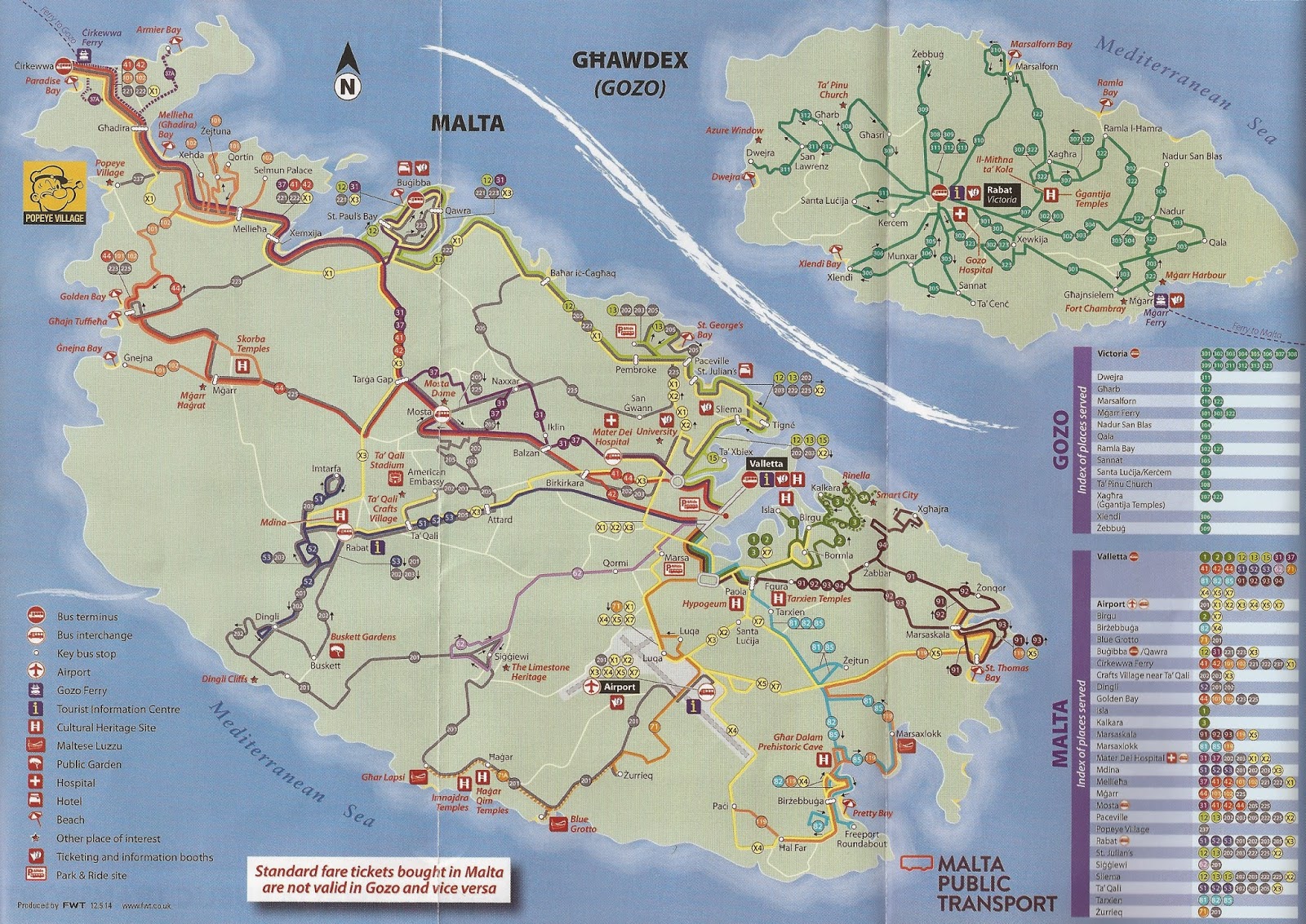 | Mapa que mostra a rede de Bus em Malta e Gozo. |
