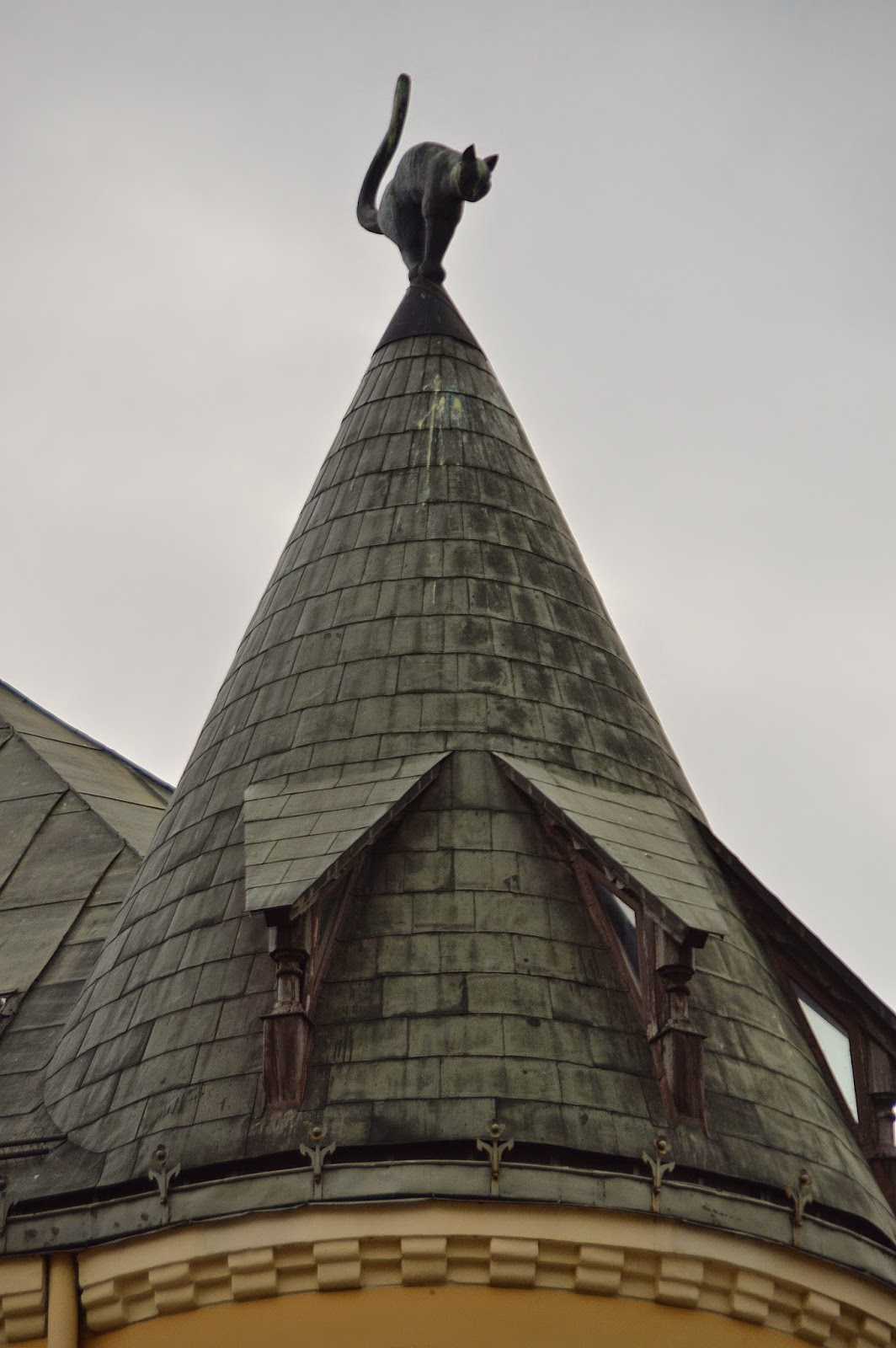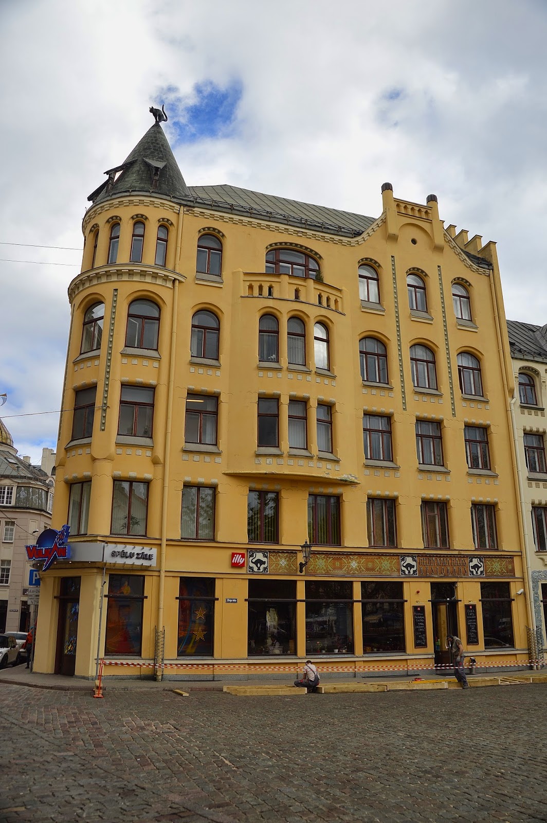 Sem dúvida a grande atração da Praça Livōnia.Este grande edifício amarelo pertenceu outrora a um homem abastado que a certa altura foi proibido de entrar no Guild.Em protesto ele resolveu erguer no topo do telhado um gato com o rabo virado para o Guild.Alguns anos mais tarde e depois de uma batalha judicial o homem lá conseguiu voltar a frequentar o espaço na condição de que a estátua teria de ser orientada noutra direção.