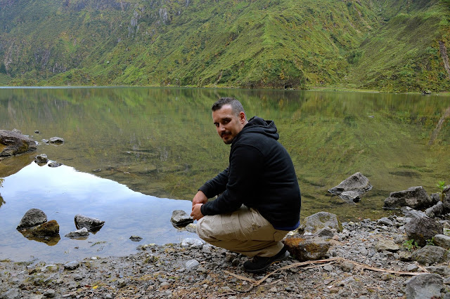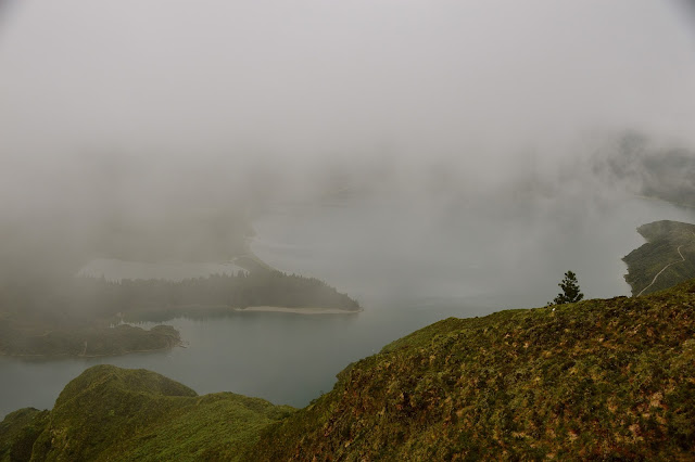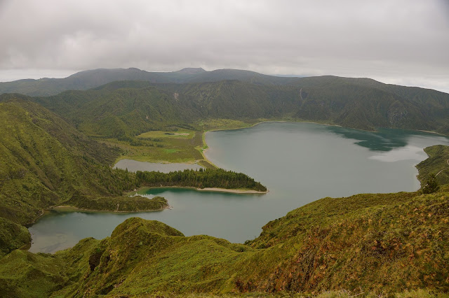 De repente todas aquelas nuvens se dissiparam e desvendaram a grandeza e a beleza daquela lagoa de águas azuis encravada numa antiga cratera vulcânica totalmente coberta por uma espessa camada de vegetação selvagem.