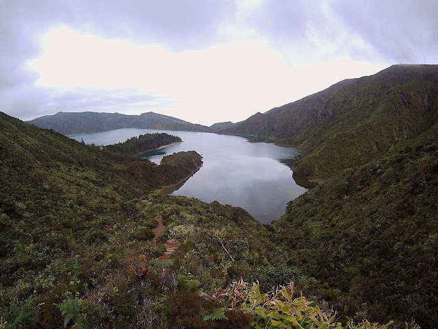 Fomos parando aqui e ali nos vários miradouros que existem ao redor da Lagoa, até que chegámos a um onde havia a possibilidade de descer através de um trilho até à margem do grande lago.