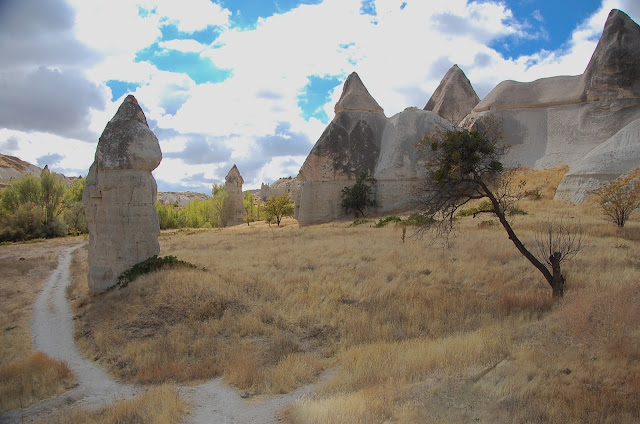 À medida que avançamos o vale vai-se tornando cada vez mais largo e pouco a pouco as famosas Chaminés de Fada começam a surgir no nosso caminho. Primeiro uma depois outra, até que a certa altura já nos encontramos completamente rodeados destas incríveis formações rochosas, algumas delas com várias dezenas de metros.