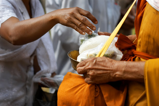 A cerimónia de Alms Giving acontece todos os dias ao amanhecer,altura em que as centenas de monges que residem nos mosteiros da cidade,saem à rua para que os habitantes locais (e agora também os turistas) lhes façam oferendas de comida.